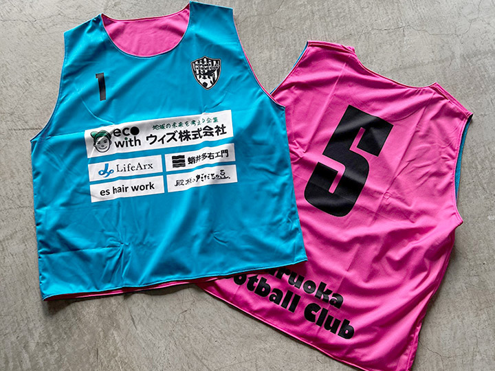 後加工の圧着ではなく、生地に昇華転写で製作しておりますので、ビブスの通気性を消さずに、使い勝手も考えて製作させていただきました。